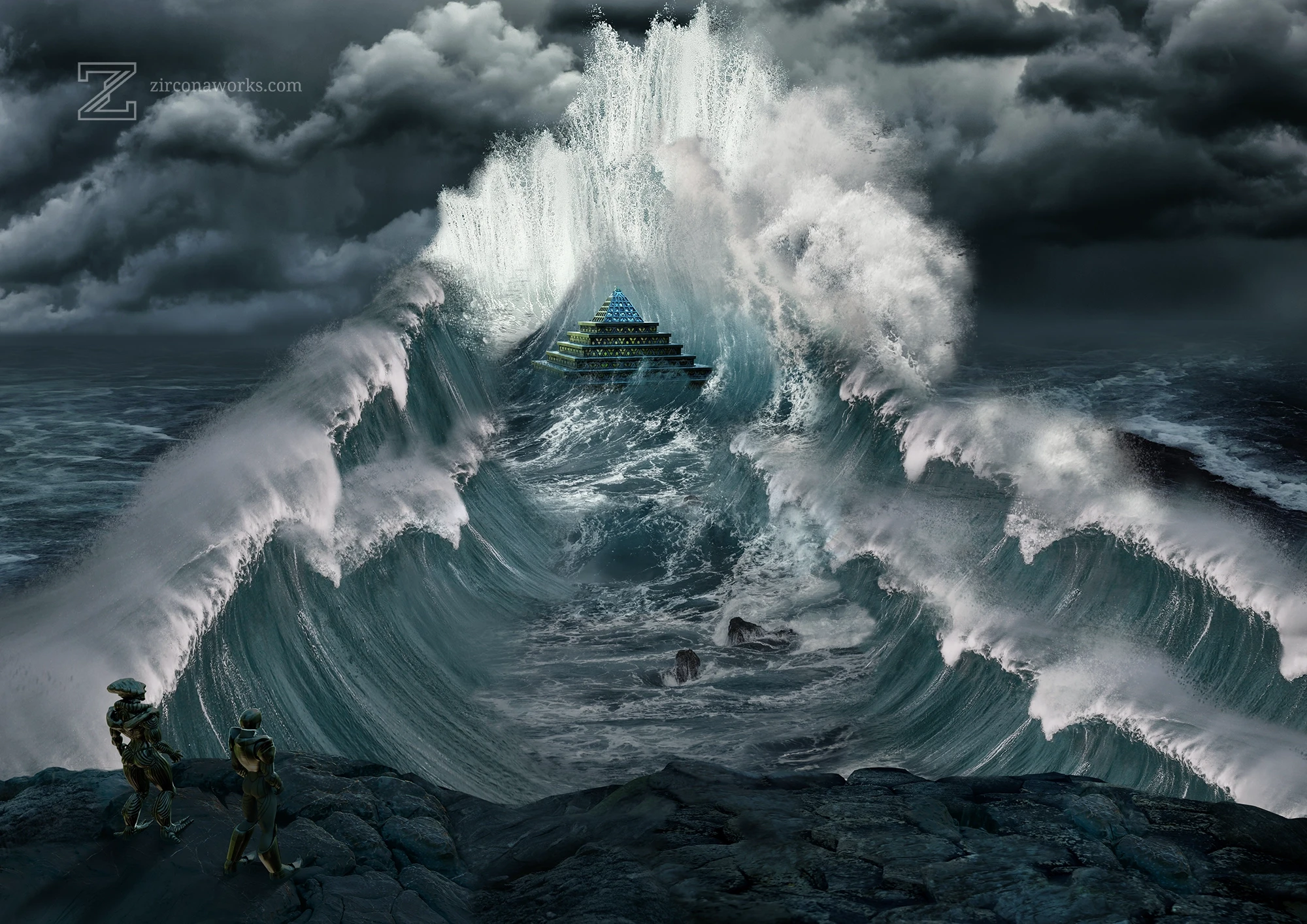 This illustration appears in my novel, 'A Sense for Memory: Part Two'. In this scene, the two antagonists of the story make an unusual discovery on an alien world. The waters part, revealing a hidden facility beneath the surface. You can read this novel from my website: https://zirconaworks.com/